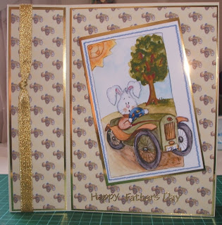 Well I have used Joanna Sheen's Messy Rabbit Cd rom for these cards. Both Fathers Day cards. The first one was for my father. It's 8"x8" and has an a5 opening section. I have used gold mirror card and cream card stock. Ribbons for detail.